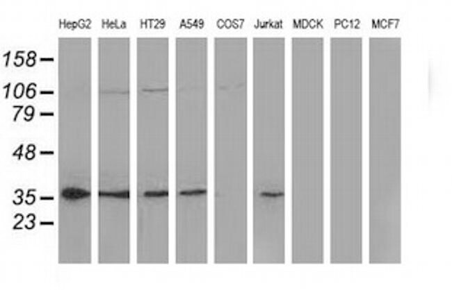 - Western blot analysis of extracts (35 µg) from 9 different cell lines by using anti-NHEJ1 monoclonal antibody.