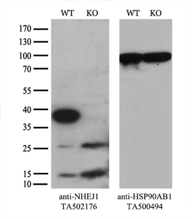 - Equivalent amounts of cell lysates (10 µg per lane) of wild-type HeLa cells (WT, Cat# LC810HELA) and NHEJ1-Knockout HeLa cells (KO, Cat#LC831412) were separated by SDS-PAGE and immunoblotted with anti-NHEJ1 monoclonal antibody TA502176(1:200). Then the blotted membrane was stripped and reprobed with anti-HSP90 antibody as a loading control.
