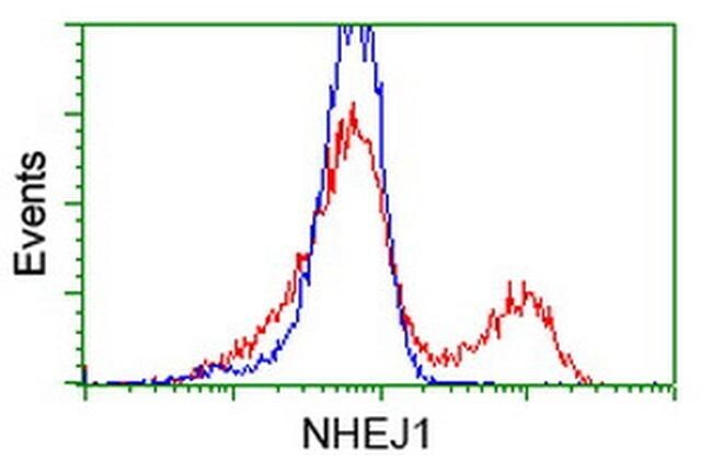 - HEK293T cells transfected with either RC203393 overexpress plasmid (Red) or empty vector control plasmid (Blue) were immunostained by anti-NHEJ1 antibody (TA502176), and then analyzed by flow cytometry.