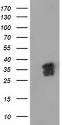 - HEK293T cells were transfected with the pCMV6-ENTRY control (Left lane) or pCMV6-ENTRY NHEJ1 (RC203393, Right lane) cDNA for 48 hrs and lysed. Equivalent amounts of cell lysates (5 µg per lane) were separated by SDS-PAGE and immunoblotted with anti-NHEJ1. Positive lysates LY403031 (100 µg) and LC403031 (20 µg) can be purchased separately from OriGene.
