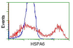 - Flow cytometric analysis of HEK293T cells transfected with either RC207795 plasmid(Red) or empty vector control plasmid(Blue) using anti-HSPA6 antibody(TA501772) at 1:100 dilution.