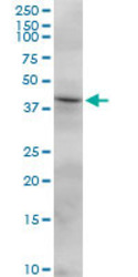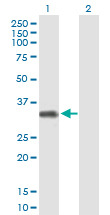 - Western Blot analysis of FCRLB expression in transfected 293T cell line (H00127943-T01) by FCRLB MaxPab polyclonal antibody.Lane1:FCRLM2 transfected lysate(34.32 KDa).Lane2:Non-transfected lysate.