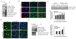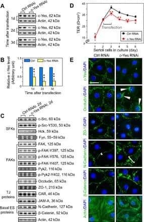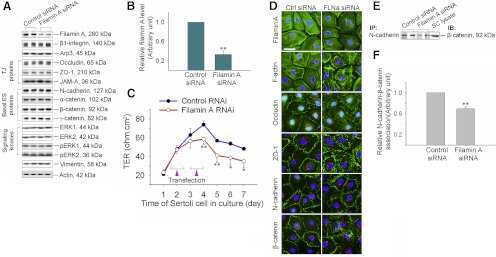 - Figure 5 Knockdown of Rai14 in the Sertoli cell epithelium with an established TJ-permeability barrier in vitro by RNAi disrupts actin filament organization and the TJ barrier. (A) Sertoli cells cultured alone on Matrigel-coated 12-well dishes for 2-day with an established TJ-permeability barrier were transfected with Rai14 siRNA duplexes (Rai14 RNAi) versus non-targeting control duplexes (Ctrl RNAi) at 100 nM using Ribojuice transfection medium for 24 hr, thereafter, cells were washed twice and cultured in F12/DMEM for 12 hr to allow recovery. Thereafter, cells were transfected again under the same conditions for another 24 hr. Thereafter, cells were rinsed with fresh F12/DMEM and cultured for an additional 12 hr before termination, and used to prepare lysates for immunoblotting using antibodies against several BTB-associated constituent or regulatory proteins. A knockdown of Rai14 by ~50% was noted in which the control was arbitrarily set at 1 against which statistical comparison was performed (B) without any apparent off-target effects (A). The findings shown herein are the results of 3 independent experiments excluding pilot experiments which were used to establish optimal experimental conditions, such as different concentrations of siRNA duplexes and Ribojuice. It was noted that we achieved only ~50-60% knockdown of Rai14 in several pilot experiments, unlike other target genes [ e.g ., Scribble, beta1-integrin, and P-glycoprotein] wherein we could silence the target gene