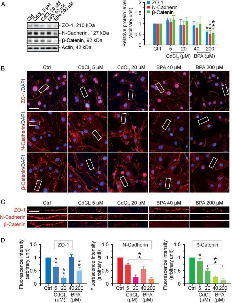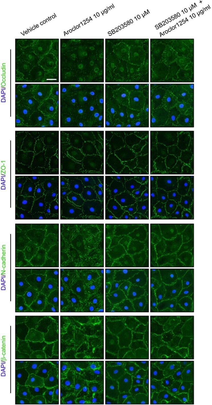 - Figure 3 Aroclor1254 influenced distribution of junction proteins in primary SCs. Primarily isolated SCs were cultured on matrigel-coated coverslips at 0.05 x 10 6 /cm 2 . On day 3, Aroclor1254 (10 mu g/mL), SB203580 (10 mu m ), or the mixture of the above two was added to the medium. After 24 h, the cells were fixed with 4% paraformaldehyde. The distribution of BTB proteins at cell-cell junctions was observed by immunofluorescence using Alexa Fluor 488-conjugated secondary antibody (green) with cell nuclei stained with DAPI (blue). A reduced signal of occludin and disturbed distributions of N-cadherin and beta -catenin were detected at cell junctions of Aroclor1254-treated SCs, as compared with the sharply defined signals in the control and the Aroclor1254+SB203580 groups. Scale bar=25 mu m, which applied to all micrographs in Figure 3