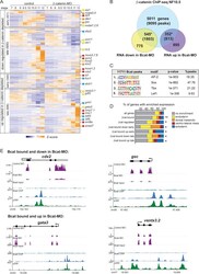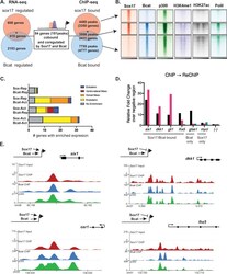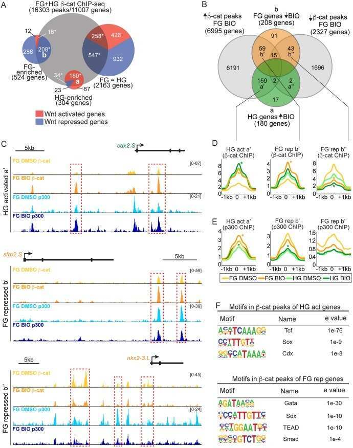 - Figure 4. Sox17 and Bcat co-occupy enhancers to regulate the endoderm GRN. ( A ) Eighty-four genes (191 Peaks) are cobound and coregulated by Sox17 and Bcat. Venn diagram show that 415 genes are regulated by both Sox17 and Bcat (left), whereas 2411 genes (3956 peaks) are bound by both Sox17 and Bcat. Gene intersections are significant based on hypergeometric tests, *p