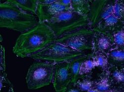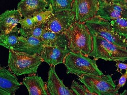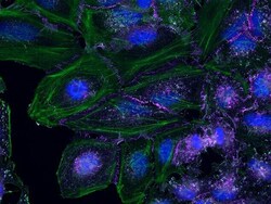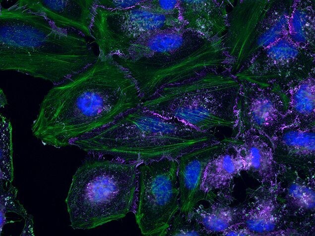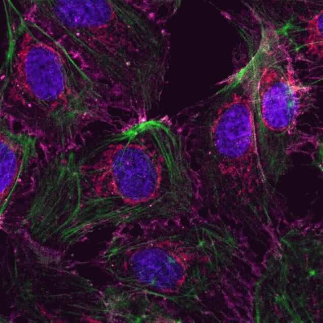 - Human Umbilical Vein Endothelial Cells (HUVEC; C0035C) were grown to confluency in Medium 200 (Product # M-200-500) plus Large Vessel Endothelial Supplement (LVES; Product # A1460801). Cells were fixed with 4% formaldehyde and permeablized with 0.25% Triton X-100 followed by staining with mouse anti-ATP synthase subunit IF-1 monoclonal antibody (Product # A-21355) and rabbit anti-ß-Catenin polyclonal antibody (Product # 71-2700). Primary antibodies were detected with Qdot® 605 Goat F (ab')2 anti-mouse IgG Conjugate (Red; Product # Q11002MP) and Qdot® 655 Goat F (ab')2 anti-rabbit IgG Conjugate (Magenta, Product # Q-11421MP), respectively. Cells were counterstained with NucBlue® Fixed Cell (Blue; Product # R37606) and ActinGreen 488 (Green, Product # R37110) ReadyProbes Reagents. Cover slips were air dried, mounted with Cytoseal 60, and imaged on a Zeiss LSM 710 confocal microscope.