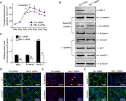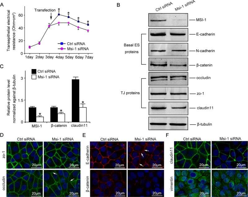 - FIGURE 2: Msi-1 knockdown by RNAi in Sertoli cells perturbs Sertoli cell-cell junctions via changes in BTB-associated proteins. (A) On day 3, Sertoli cells were transfected with Msi-1-specific siRNA duplexes and nontargeting control siRNA duplexes. The TER was detected until day 7, and each data point is the mean +- SD of n = 5 replicates from a representative experiment. *, p < 0.05. (B) Immunoblot showing the steady-state levels of Msi-1, basal ectoplasmic specialization (ES) proteins, and TJ proteins in lysates of Sertoli cells lysed 48 h after transfection; beta-tubulin served as a loading control. (C) Histogram summarizing selected immunoblotting results in B and normalized against beta-tubulin. Each bar represents the mean +- SD of n = 3 experiments. *, p < 0.05. (D-F) Changes in the localization of TJ proteins, basal ES proteins, and the framework protein vimentin at Sertoli cell-cell interfaces after Msi-1 knockdown were assessed 48 h after transfection. Sertoli cell nuclei were stained with DAPI. Note that considerably less beta-catenin and claudin-11 were detected, and the distributions of occludin and E-cadherin (white arrows) were changed at Sertoli cell-cell interfaces after Msi-1 knockdown. Scale bars: 20 mum.