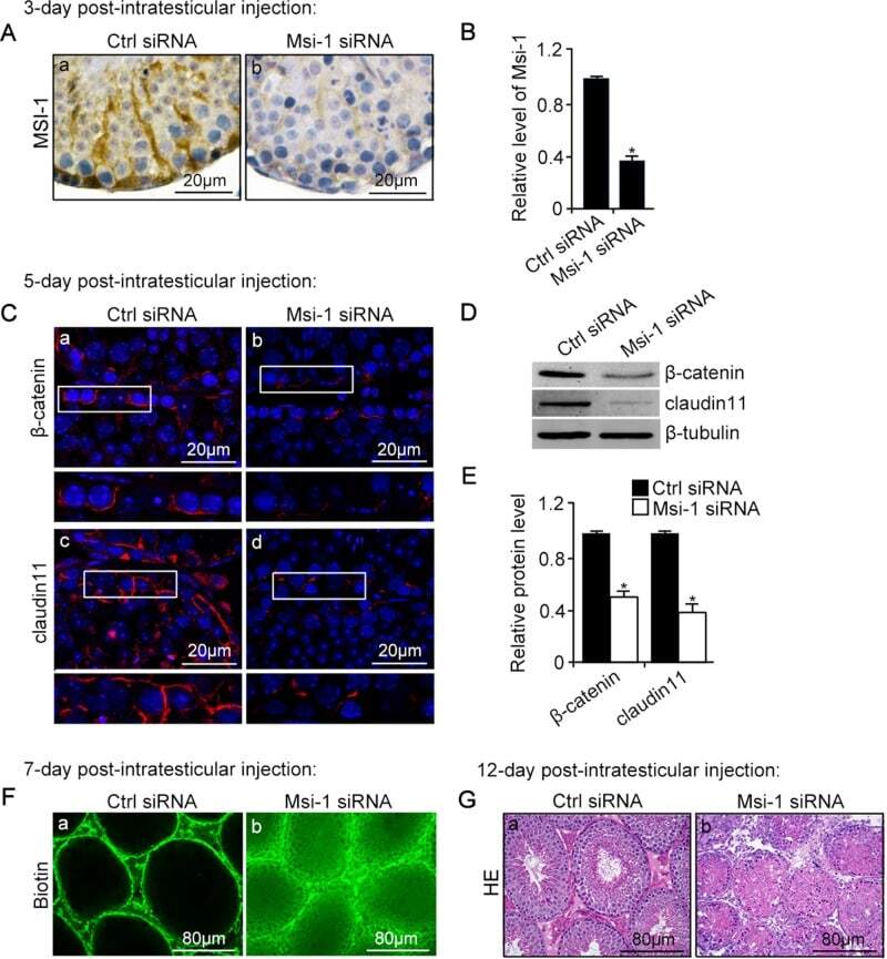 - FIGURE 3: An in vivo study assessing the role of Msi-1 in BTB function and spermatogenesis by RNAi intratesticular injection. Msi-1-targeting siRNA duplexes and nontargeting duplexes were administered to each testis in adult mice as a single treatment. The knockdown efficiency, BTB-associated protein expression, biotin tracer experiment, and hematoxylin-eosin (HE) staining at 3, 5, 9, and 12 d postintratesticular injection, respectively. (A) Considerably more intense Msi-1 staining was observed in the Sertoli cells from testes transfected with nontargeting control (a) versus testes transfected with Msi-1-specific siRNA duplexes (b). Scale bars: 20 mum. (B) Histogram summarizing immunoblotting results of Msi-1 and normalized against beta-tubulin. Each bar represents the mean +- SD of n = 3 experiments. *, p < 0.05. (C) Paraffin sections were used to study changes in the expression of beta-catenin (a and b) and claudin-11 (c and d) after Msi-1 knockdown in vivo. The boxed area was randomly selected. Scale bars: 20 mum. (D) The protein levels of beta-catenin and claudin-11 in nontargeting control and Msi-1 knockdown testes. beta-tubulin served as a loading control. (E) Histogram summarizing selected immunoblotting results in D and normalized against beta-tubulin. Each bar represents the mean +- SD of n = 3 experiments. *, p < 0.05. (F) We injected a biotin tracer into the testes of live anesthetized mice ( n = 3) and examined the subsequent changes in BTB integrity after siRNA d