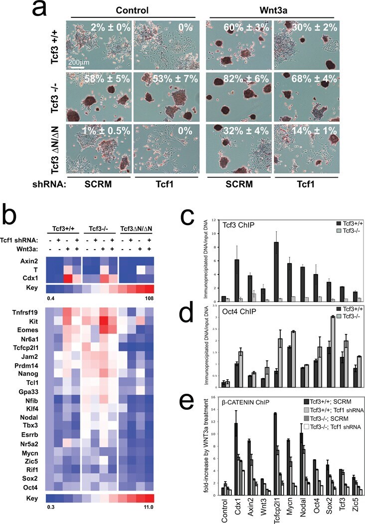 - Figure 6 Combined effect of Tcf1 and Tcf3-beta-catenin for the Wnt3a response of ES cells (a) Alkaline phosphatase staining of colonies from ES cell lines with different Tcf3 genotypes (indicated on left) and expressing an shRNA (indicated on bottom). Colonies were formed for four days in serum containing media without LIF, and with control or Wnt3a (indicated on top). Percentage of AP+ colonies (white number) represents mean +- standard deviation of biological duplicates. Wnt3a stimulated self-renewal at different levels in Tcf3+/+ , Tcf3-/- and Tcf3DeltaN/DeltaN ES cells, while knockdown of Tcf1 significantly reduced stimulations in all three ES cell lines. (b) Gene expression analysis in different Tcf3 ES cell lines +- Tcf1 shRNA and +- recombinant Wnt3a. The relative level of mRNA for each gene is compared to untreated Tcf3+/+ cells set at 1.0. Numerical values +/- standard deviations are shown in Supplementary Table S5 . (c-e) Chromatin immunoprecipitated with antibodies against Tcf3 (c), Oct4 (d), or beta-catenin (e) was measured by qPCR using primers ( Supplementary Table S5 ) specific for upstream regions of the ten genes labeled at the bottom of graph shown in (e). A representative graph from three biological replicates is shown for each experiment. (c,d) Assays were performed using chromatin from Tcf3+/+ (black) and Tcf3-/- (gray) ES cells. Values represent the mean percentage of DNA immunoprecipitated relative to input +- standard deviations of replicate measuremen