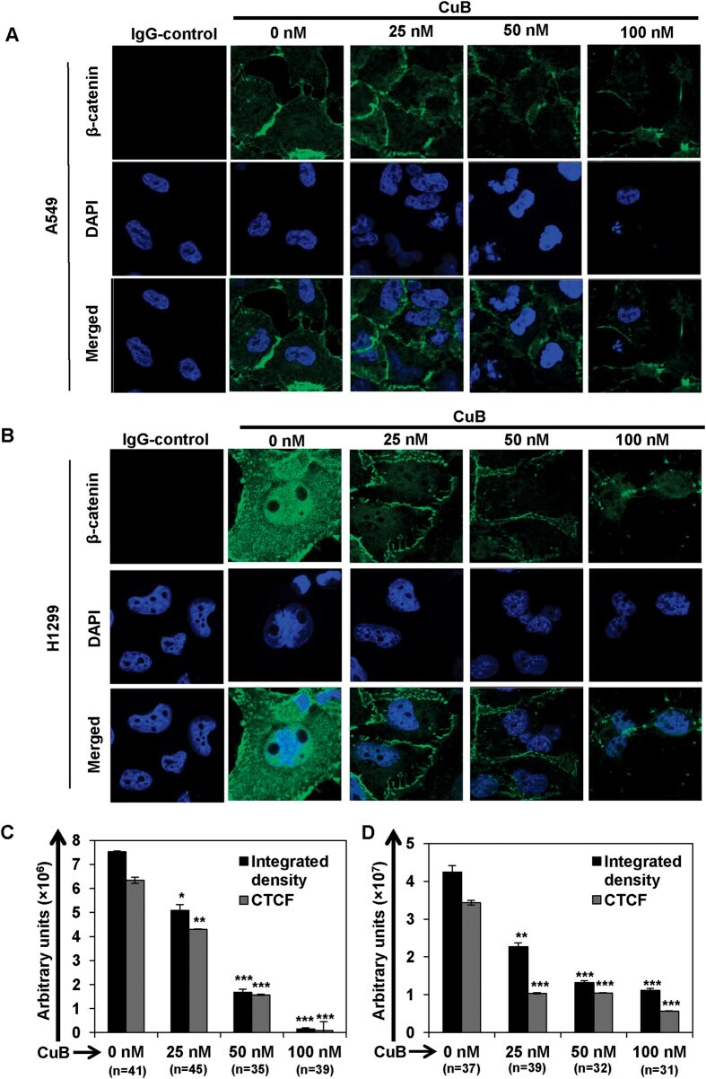 - Figure 3 CuB inhibits the expression and nuclear translocation of beta-catenin in NSCLC cells. A549 (Panel A ) and H1299 (Panel B ) cells were seeded on glass cover slips for 24 h and then treated with varying concentrations of CuB for 24 h. Endogenous cytoplasmic and nuclear beta-catenin (FITC-green) localization was visualized by immunofluorescence followed by confocal imaging. DAPI was used as nuclear stain (blue). IgG control was used as the negative control. Images are representative of three-independent experiments. The graphs (Panels C , D ) represent the raw integrated density as well as CTCF values in A549 and H1299 cells, respectively. The numbers in parenthesis are indicative of number of cells analyzed for each group.