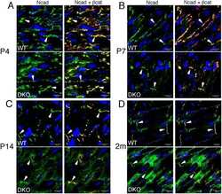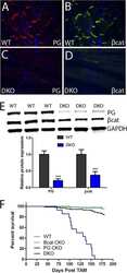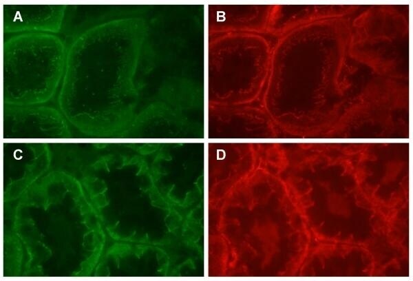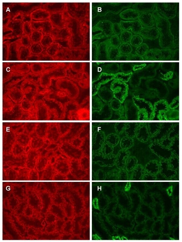 - Figure 8 Dual labeling of N-cadherin and beta-catenin in the proximal tubule. Panels A and B show that dual labeling of N-cadherin (A) and beta-catenin (B) in the S1/S2 segment of the proximal tubule, whereas panels C and D show the dual labeling of N-cadherin (C) and beta-catenin (D) in the S3 segment of the proximal tubule. Original magnification = 435x.
