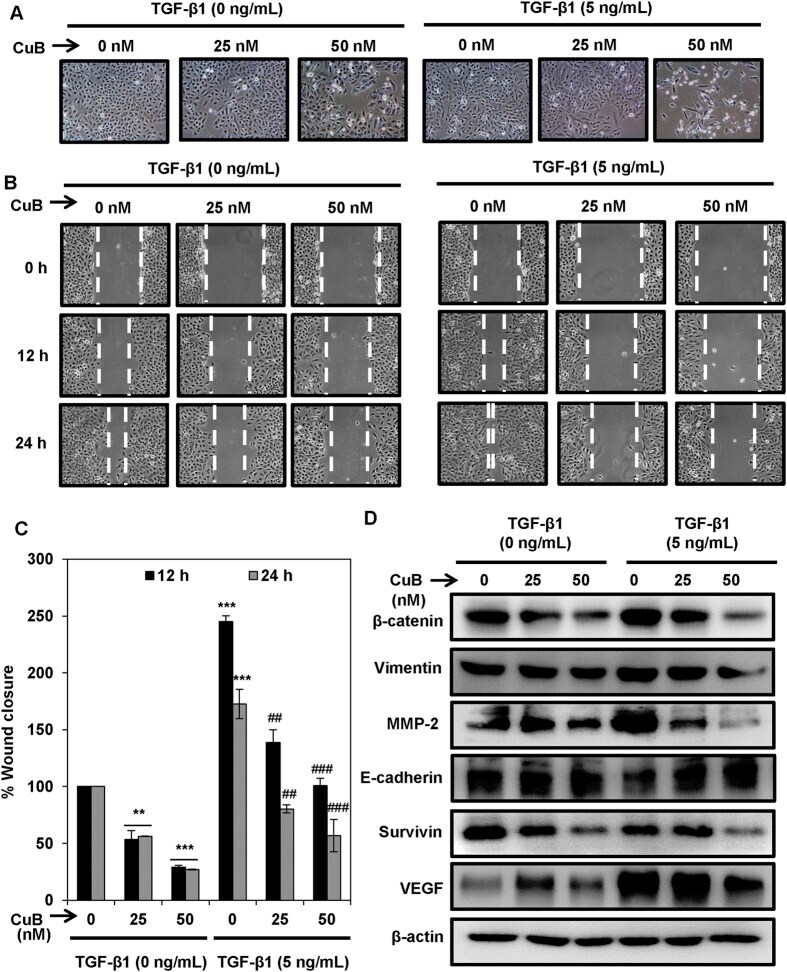- Figure 5 CuB treatment abrogates TGbeta-1-induced EMT in A549 cells. ( A ) A549 cells were treated with TGF-beta1 (5 ng/mL) for 24 h. TGF-beta1 treated and untreated A549 cells were treated with 25 and 50 nM concentrations of CuB for 24 h. Morphological changes are shown in light microscopic images (100x magnification). ( B , C ) Wounds were created in the sub-confluent cultures of A549 cells and then cells were treated with TGF-beta1 (5 ng/mL) and 25 and 50 nM CuB. Photomicrographs were captured at 0, 12 and 24 h after treatment and wound area was measured. Data were expressed as percent wound closure in the treatment groups compared to control. The results were obtained from three independent experiments, mean +- SEM. **p < 0.01 and ***p < 0.001 compared to untreated control, ## p < 0.01 and ### p < 0.001 compared to respective TGF-beta1-treated control group. ( D ) A549 cells were treated as in (Panel A ), and whole cell lysates were prepared. Western blot analysis was performed to analyze the expression of EMT markers. Blots are representative of three independent experiments.