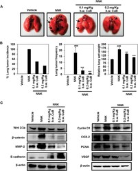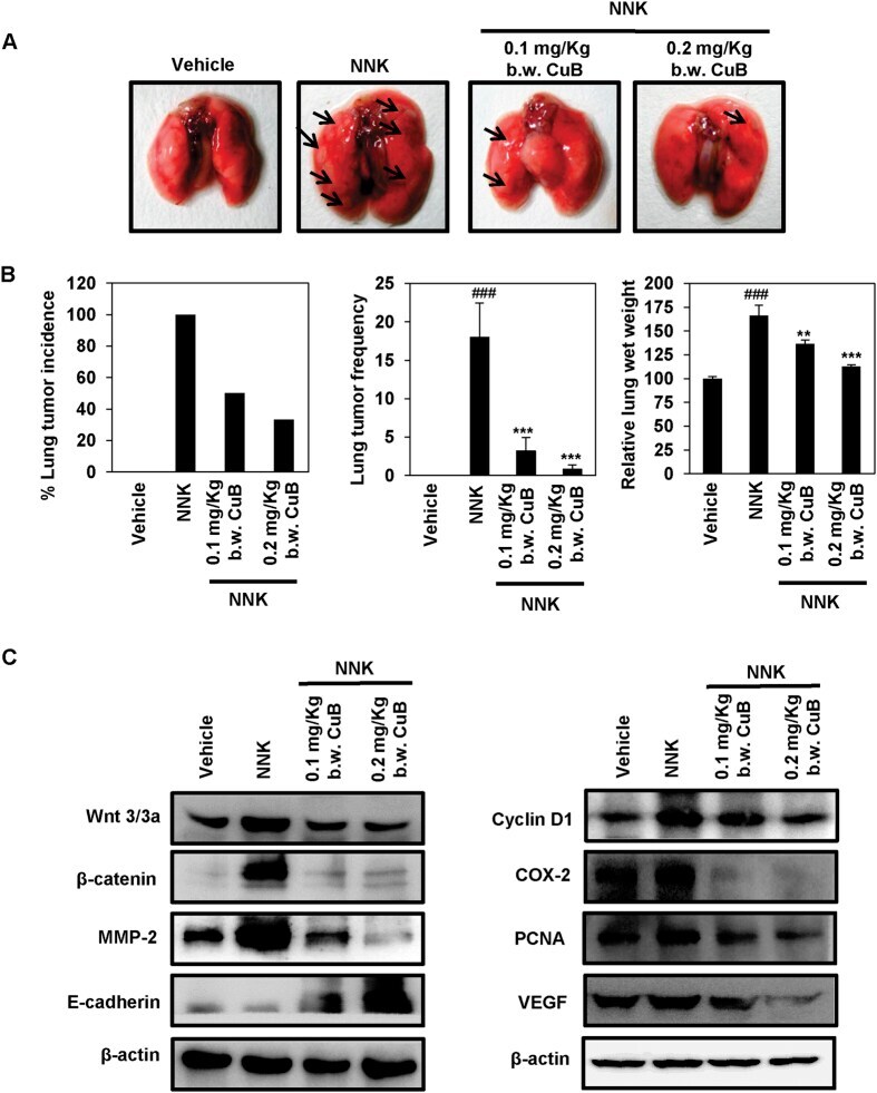- Figure 8 CuB inhibits NNK-induced lung tumorigenesis and Wnt/beta-catenin/MMP-2 signaling. ( A ) Representative images of vehicle-treated, NNK-induced CuB-untreated as well as 0.1 mg/Kg and 0.2 mg/Kg b.w. CuB-treated mice lungs. ( B ) Effects of CuB on lung tumor incidence, lung tumor frequency and relative lung wet weights in NNK-treated mice. mean +- SEM. ### p < 0.001 compared to vehicle-treated lungs, ** p < 0.01 and *** p < 0.001 compared to NNK-induced lungs. ( C ) Tissue lysates from each animal group were used to analyze the expression of different Wnt/beta-catenin signaling markers. beta-actin was used as equal loading control. Blots are representative of three independent experiments.