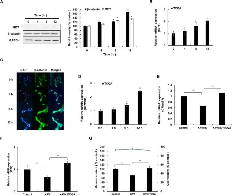 - FIGURE 4 3,4,5-Tri- O -caffeoylquinic acid (TCQA) stimulated beta-catenin and microphthalmia-associated transcription factor (MITF) expression in human epidermal melanocytes (HEMs). (A) Protein expression of MITF and beta-catenin after 0, 4, 8, and 12 h of treatment with 10 muM of TCQA. (B) Gene expression of MITF after 0, 1, 6, and 12 h of treatment with 10 muM of TCQA. (C) Immunocytochemistry of beta-catenin expression after 0, 4, 8, and 12 h of treatment with 10 muM of TCQA. Scale bar = 25 mum; magnification at 20x. (D) Gene expression of CTNNB1 after 0, 1, 6, and 12 h of treatment with 10 muM of TCQA. (E) Gene expression CTNNB1 after treatment with 10 muM of XAV939 and co-treatment of 10 muM of XAV939 and 10 muM of TCQA for 24 h. (F) MITF gene expression after treatment with 10 muM of XAV939 and co-treatment of 10 muM of XAV939 and 10 muM of TCQA for 24 h. (G) Melanin assay after 48 h of treatment with 10 muM of XAV939 and co-treatment of 10 muM of XAV939 and 10 muM of TCQA for 48 h. The band intensities were done by comparing GAPDH using LI-COR system; and the mRNA level was quantified using TaqMan real-time PCR. Results represent the mean +- SD of three independent experiments. *Statistically significant ( P