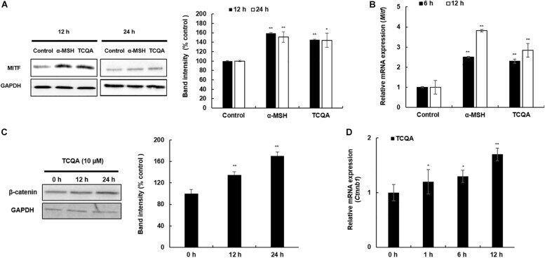 - FIGURE 5 3,4,5-Tri- O -caffeoylquinic acid (TCQA) enhanced microphthalmia-associated transcription factor (MITF) and beta-catenin expression in B16F10 murine melanoma cells. (A) Protein expression of MITF after 12 and 24 h of treatment with 0 and 25 muM of TCQA and 200 nM of alpha-MSH. GAPDH 24 h from Figure 3 band is reused in this figure. (B) Gene expression of MITF after 6 and 12 h of treatment with 0 and 25 muM of TCQA and 200 nM of alpha-MSH. (C) Protein expression of beta-catenin expression after 0, 12, and 24 h of treatment with 25 muM of TCQA. (D) Gene expression of Ctnnb1 after 0, 12, and 24 h of treatment with 25 muM of TCQA. The band intensities were done by comparing GAPDH using LI-COR system; and the mRNA level was quantified using TaqMan real-time PCR. Results represent the mean +- SD of three independent experiments. *Statistically significant ( P