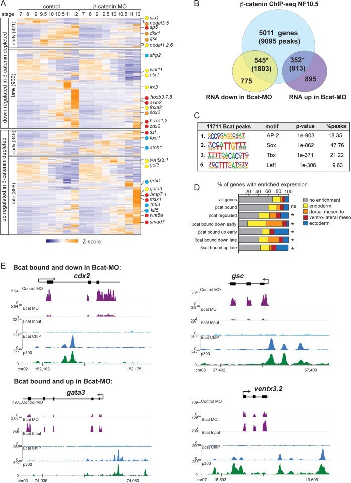 - Figure 3. The Bcat-regulated genomic program. ( A ) Time course heatmap of Bcat-regulated transcripts. Differential expressed genes from a pairwise comparison of control-MO and Bcat-MO embryos ( > 2 FC, FDR < 5%) at each stage identified 2568 Bcat-regulated transcripts; 1321 downregulated and 1247 upregulated in Bcat-MO embryos. Key genes are color coded based on regional expression from ( D ). ( B ) Venn diagram intersecting Bcat-regulated genes with Bcat-bound genes (and associated peaks) from published X. tropicalis gastrula Bcat ChIP-seq data () identified 898 putative direct targets associated with 2616 peaks. Statistically significant intersections based on hypergeometric tests* p
