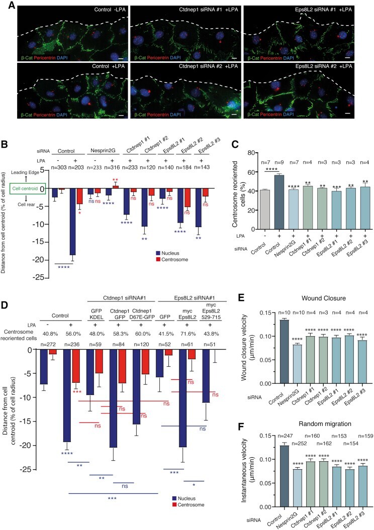 - Figure 1 Ctdnep1 and Eps8L2 are required for nuclear positioning and cell migration in fibroblasts (A) Representative images of wound-edge 3T3 fibroblasts with or without LPA stimulation in control, Ctdnep1, and Eps8L2 siRNAs stained for beta-catenin (green, cell contacts), pericentrin (red, centrosome), and DAPI (blue, nucleus). The dashed white lines mark the wound edge. (B) Average positions of the nucleus (blue) and centrosome (red) relative to the cell centroid in cells treated with control, Nesprin2G, Ctdnep1, and Eps8L2 siRNAs. (C) Percentage of oriented cells in the conditions analyzed in (B). (D) Average positions of the nucleus (blue) and centrosome (red) in cells treated with Ctdnep1 or Eps8L2 siRNAs and microinjected with KDEL-GFP, Ctdnep1-GFP, Ctdnep1_D67E-GFP (no phosphatase activity), GFP, myc-Eps8L2, or myc-Eps8L2_529-715. (E and F) Average wound closure velocity during wound closure migration (E) and instantaneous cell velocity in random migration (F) in cells treated with control, Nesprin2G, Ctdnep1, and Eps8L2 siRNAs. Data are represented as mean +- SEM. The n value means number of analyzed cells (B, D, and F) or number of experiments (C and E) with >50 cells analyzed per experiment. Statistics was performed by unpaired t test: * p < 0.05; ** p < 0.01; *** p < 0.001; **** p < 0.0001. Scale bars 10mum. See also Figure S1 .