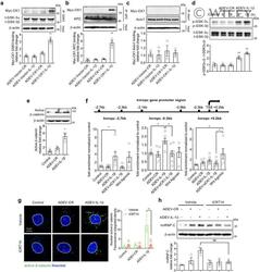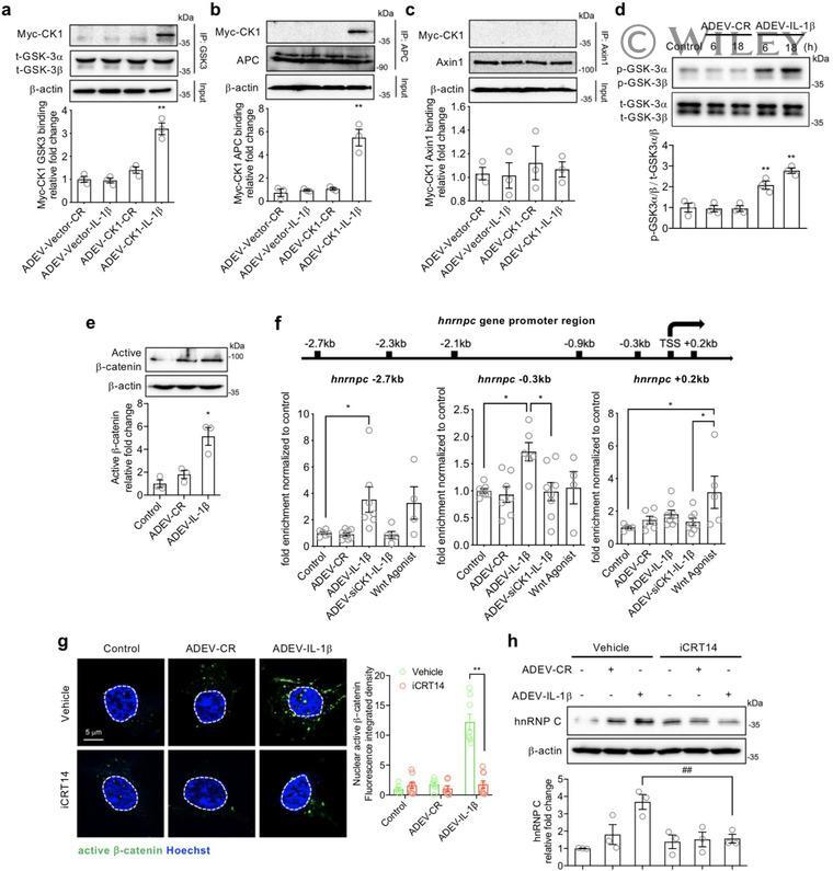 - 6 FIGURE CK1 carried in astrocyte derived EV-IL1beta directly binds to GSK3alpha/beta and APC in target neurons. Neurons were treated with astrocyte derived EV-Vector-CR (ADEV-Vector-CR), astrocyte derived EV-Vector-IL1beta (ADEV-Vector-IL1beta), astrocyte derived EV-CK1-CR (ADEV-CK1-CR), and astrocyte derived EV-CK1-IL1beta (ADEV-CK1-IL1beta) for 18 h. (a) GSK3-Myc-CK1, (b) Axin1-Myc-CK1 and (c) APC-Myc-CK1 were immunoprecipitated and the immunoblot probed for Myc tagged CK1. Myc-CK1 was quantified by band density. (d) Neurons were treated with astrocyte derived EV-CR (ADEV-CR) or astrocyte derived EV-IL1beta (ADEV-IL1beta) for 6 and 18 h, Total GSK-3alpha,beta and -GSK3alpha,beta were detected by Western blot and quantified by densitometry. (e) Neurons were treated with astrocyte derived EV-CR or astrocyte derived EV-IL-1beta for 18 h and active beta-catenin expression was measured by Western blot and quantified by densitometry. (f) Neurons were treated with astrocyte derived EV-CR (ADEV-CR), astrocyte derived EV-IL1beta (ADEV-IL-1beta), astrocyte derived EV-siCK1-IL1beta (ADEV-siCK1-IL-1beta), and Wnt agonist (20 muM) for 18 h. The binding of beta-catenin to Hnrnpc promotor sites at -2.7, -0.3 and +0.2 kb were measured by chromatin immunoprecipitation ChIP-qPCR analysis. Data are mean +- SEM of n = 3-8 independent experiments per condition. * P < 0.05, ** P < 0.01, one-way ANOVA with Tukey post hoc comparisons. (g) Neurons were treated with astrocyte derived EV-CR, astrocy