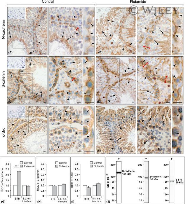 - Qualitative and quantitative analysis of immunohistochemical staining for N-cadherin (A-C, G), beta-catenin (C-D, H) and c-Src (E-F, I). Representative micrographs of control (A, C, E) and flutamide-treated rats (B, D, F) and a histogram of N-cadherin (G), beta-catenin (H) and c-Src (I) staining intensity expressed as relative optical density ( ROD ) of diaminobenzidine brown reaction products. Immunohistochemical localization of N-cadherin (A-B). Typical distribution of N-cadherin is visible in the basal compartment of the seminiferous epithelium at the blood-testis barrier ( BTB ) (arrowheads, see also the higher magnification) and at the Sertoli cell-elongated spermatid interface (arrows) in testes of control rats (A). In tubules of flutamide-treated rats, increased staining intensity at the BTB (arrowheads, see also the higher magnification) is visible. Note a diffusion of N-cadherin from the BTB site (red bracket) (B). Immunohistochemical localization of beta-catenin (C-D). Typical localization of beta-catenin is visible at the BTB site (arrowheads, see also the higher magnification) and at the Sertoli cells-elongated spermatids interface (arrows) in testes of control rats (C). In tubules of flutamide-treated rats a diffusion of beta-catenin from the BTB site is visible (red bracket) (D). Immunohistochemical localization of c-Src (E-F). Typical localization of c-Src is visible in the basal compartment of seminiferous epithelium at the BTB (arrowheads, see also the higher
