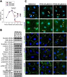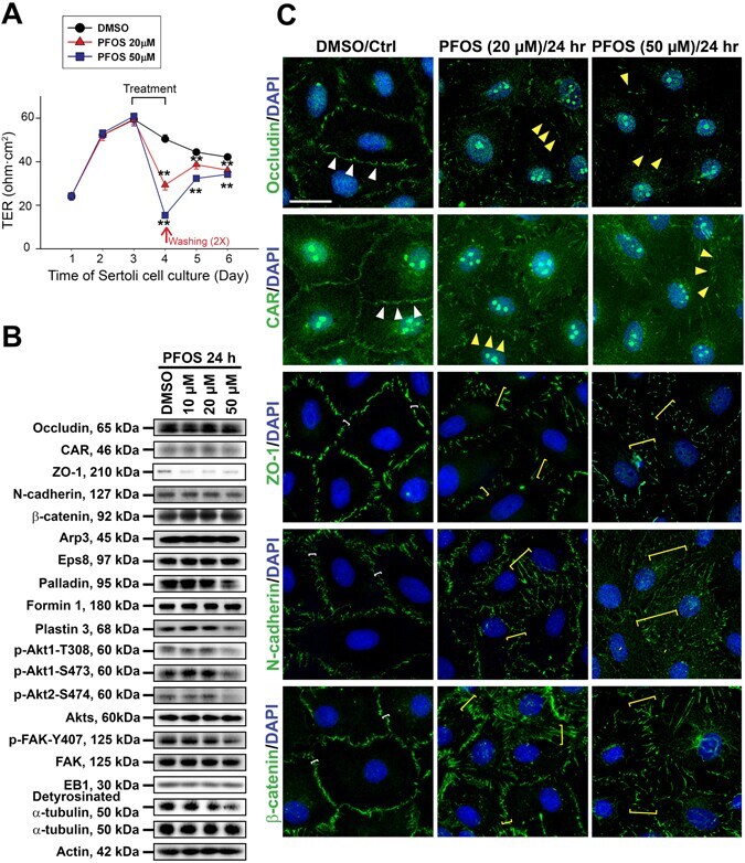 - Figure 1 PFOS perturbs Sertoli cell BTB function through changes in the expression and/or localization of proteins at the immunological barrier. Sertoli cells cultured on Matrigel-coated bicameral units, dishes or coverslips were treated on day 3 with 10, 20 or 50 muM PFOS for 24 hr. Thereafter, cells were washed twice with PBS to remove residual PFOS and terminated for immunoblotting (IB) or IF on day 4. ( A ) Typical results of a TER experiment that monitored the effects of PFOS, at 20 uM and 50 uM vs . vehicle control (DMSO) on the Sertoli cell TJ-permeability barrier. Each data point is a mean +- SD of triplicate units from an experiment, which was repeated 3 times and yielded similar results. ** P < 0.01 by Student's t -test compared between PFOS-treated and control cells. ( B ) Immunoblot analysis to assess the effects of PFOS on the expression of TJ proteins: occludin, CAR and ZO-1; basal ES proteins: N-cadherin and beta-catenin; actin regulatory proteins: Arp3, Eps8, palladin, formin 1 and plastin 3; signaling molecules: activated Akts: p-Akt1-T308, p-Akt1-S473, pAkt2-S474 vs . Akts (including Akt1, 2 and 3), and activated FAK: p-FAK-Tyr407 vs . FAK; MT regulatory proteins: EB1 and detyrosinated alpha-tubulin. Actin and alpha-tubulin served as protein loading controls. PFOS was found to down-regulate p-Akt1-T308, p-Akt1-S473, p-Akt2-S474 and p-FAK-Tyr407. Composite data of immunoblottings are shown in Figure S1A ; and uncropped blots are shown in Figure S4 . ( C ) Imm