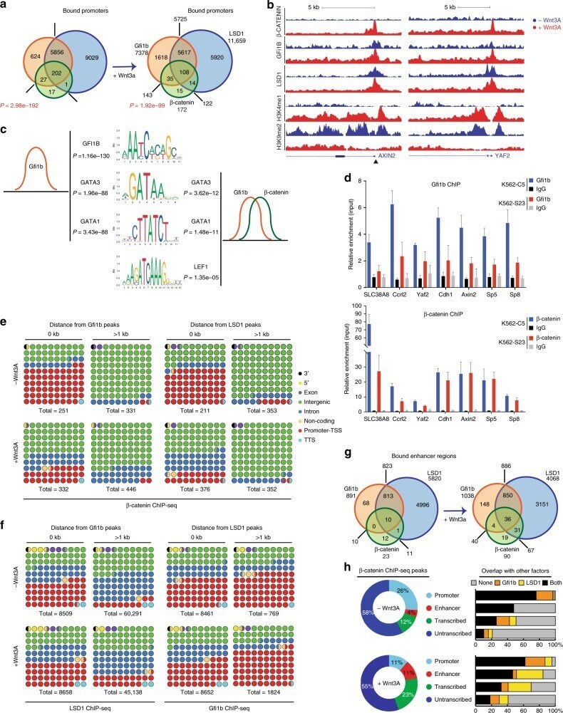 - Fig. 8 GFi1b, beta-catenin and LSD1 co-occupy sites at enhancer regions and gene promoters. a Venn diagram showing GFI1B, beta-catenin and LSD1 ChIP-seq promoter binding prior to and after Wnt3A treatment of K562 cells. P indicates statistical significance of overlap between GFI1B and beta-catenin calculated using Fisher's exact test. b Example of target genes Axin2 and Yaf2 bound by GFI1B, beta-catenin and LSD1 and H3K4me1 and H3K9me2 enrichment before and after Wnt3A treatment. Arrowhead indicates the presence of Gfi1b and TCF binding motifs in the Axin 2 promoter. c Motif enrichment analysis under GFI1B peaks alone (top) and Gfi1b/beta-catenin overlapped peaks (bottom). d GFI1B (top) and beta-catenin (bottom) ChIP-PCR analysis in K562 stable clones expressing GFI1B (S23) or scramble (C5) shRNA (error bars show s.d, n = 3 technical replicates). e Distribution of beta-catenin peaks based on their distance to GFI1B peaks (left panel) and LSD1 peaks (right panel). f Distribution of LSD1 peaks based on their distance to GFI1B peaks (left panel) and reversely (right panel). g Venn diagram showing GFI1B, beta-catenin and LSD1 binding at enhancer regions prior to and after Wnt3A treatment of K562 cells. h Distribution of beta-catenin peaks (left) and their overlaps with GFI1B and/or LSD1 peaks based on the genomic feature of each bound region