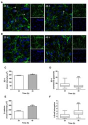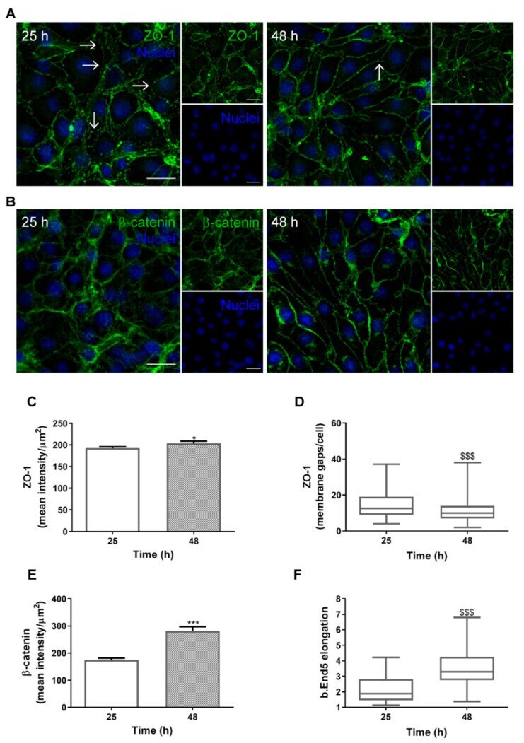 - Figure 1 Shear stress (SS) promotes brain microvascular endothelial properties. Confluent monolayers of the brain endothelioma cell line b.End5 were exposed to physiological laminar non-pulsatile SS for 25 and 48 h. SS effects were evaluated by immunofluorescence analysis of the tight and adherens junction proteins ( A ) zonula occludens (ZO)-1 and ( B ) beta-catenin, respectively, which showed a delocalisation of the proteins towards the cell membrane and a decrease in membrane gaps (white arrows). Hoechst 33342 was used as counterstaining for nuclei (blue). Scale bar: 20 um. Semi-quantitative analysis of ZO-1 expression showed ( C ) a slight increase in staining intensity, from 25 to 48 h, and a ( D ) marked decrease in cell membrane gaps, while beta-catenin presented ( E ) a notorious increase in fluorescence intensity, and ( F ) a clear cellular elongation. Data are given as means +- SEM ( n = 3, 10 fields/condition). A Student's t -test for mean intensity and a Mann-Whitney test for membrane gaps and cell elongation were used to evaluate the significant differences, where * p < 0.05 and *** p < 0.001 or $$$ p < 0.001 denote differences between the indicated timepoints.