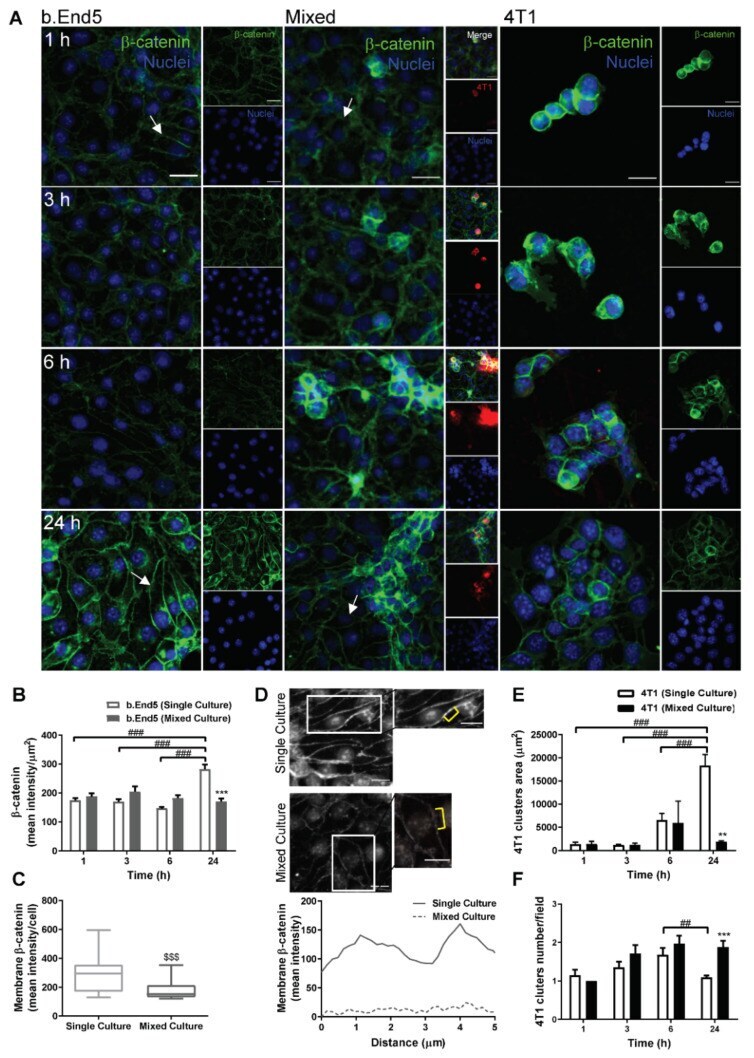 - Figure 2 Adherens junctions are compromised during interaction between breast cancer cells and brain microvascular endothelial cells. Confluent monolayers of the brain endothelioma cell line b.End5 under physiological laminar non-pulsatile shear stress were exposed to 4T1 breast cancer cells (previously labelled with CellTracker(tm) DMTPX Red Dye) for 1, 3, 6 and 24 h and the expression of the adherens junction protein, beta-catenin, in single and mixed cultures was evaluated by immunofluorescence analysis. ( A ) Analysis of the expression of beta-catenin (green) revealed that the protein is present in both cell types, with a different cellular distribution in mixed cultures as compared with single ones, and further revealed a loss of elongation in b.End5 cells exposed to 4T1 cells (white arrows). Hoechst 33342 was used as counterstaining for nuclei (blue). Scale bar: 20 um. Semi-quantitative analysis revealed ( B ) a decrease in endothelial beta-catenin intensity in mixed culture at 24 h, ( C ) particularly notorious at the cell membrane, which was validated by the ( D ) plot profile analysis of the membrane region pointed out with the yellow brackets. Scale bar: 20 um. The characterisation of 4T1 cells was performed by the quantification of the ( E ) area of tumoural clusters, which increased over time in single cultures, and ( F ) number of clusters, which decreased at 24 h in single culture. Data are given as means +- SEM ( n = 3, 10 fields/condition). A one-way ANOVA was