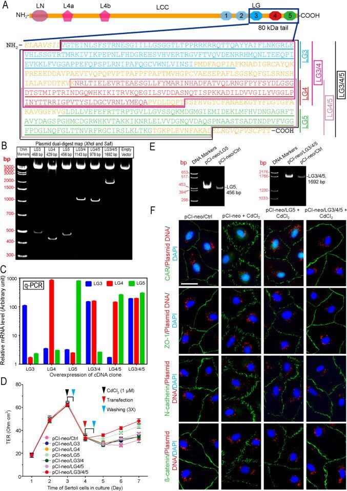 - Fig. 1 LG3/4/5 protects Sertoli cells from cadmium-induced TJ-barrier disruption. a Preparation of cDNA constructs based on the 80 kDa tail of the laminin-alpha2 chain. The top panel is a schematic drawing that illustrates the functional domains of laminin-alpha2 chain. From the N-terminus, the short arm of laminin-alpha2 is comprised of three globular domains: laminin N-terminal domain (LN), laminin 4a domain (L4a) and laminin 4b domain (L4b). The long arm of laminin-alpha2 is comprised of laminin coiled coil (LCC) domain and five C-terminal laminin-type globular (LG) domains of LG1, 2, 3, 4, and 5. Proteolytic cleavage is close to the N-terminus of LG3 to generate the LG3/4/5 (i.e., the 80 kDa fragment). Six different cDNA constructs, namely LG3 (underlined in blue), LG4 (underlined in red), LG5 (underlined in green), LG3/4 (boxed in pink), LG4/5 (boxed in purple), and LG3/4/5 (boxed in black), were obtained by PCR using Sertoli cell cDNAs as the template and the corresponding specific primer pairs (Table 1 ), with the exception of the LG3/4/5 clone which was obtained by first denaturing LG3/4 and LG4/5, so that these two clones were annealed and then served as the template for PCR by using primer pairs (1) and (6). These constructs were cloned into the mammalian expression vector pCI-neo (Promega). Amino acid residues in orange represent sequences between the different LG domains and the italicized orange residues were not cloned into any of the cDNA constructs, such as LG