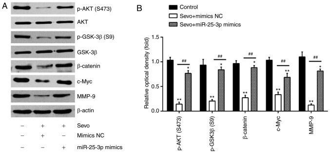 - Figure 5 Sevo blocks the PTEN/Akt/GSK-3beta/beta-catenin signaling pathway by modulating the expression of miR-25-3p in HCC cells. HCCLM3 and Huh7 cells were transfected with miR-25-3p mimics or miR-25-3p inhibitor for 24 h followed by Sevo treatment for 6 h. (A) Protein levels of p-Akt, Akt, p-GSK-3beta, GSK-3beta, beta-catenin, c-Myc and MMP9 were measured using western blotting. beta-actin served as the loading control. (B) The bands were semi quantitatively analyzed using ImageJ and normalized to beta-actin density. Data are presented as the mean +- standard deviation. (n=3) of three representative experiments. * P
