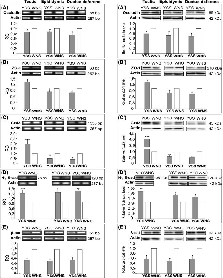 - Figure 1 Occludin, ZO-1, Cx43, N- and E-cadherin, and beta-catenin mRNA (A to E) and protein (A' to E') expression in yellow semen syndrome (YSS) and white normal semen (WNS) testes, epididymides, and ductuli deferentes. Representative quantitative real-time PCR analysis of occludin (A), ZO-1 (B), Cx43 (C), N- and E-cadherin (D), and beta-catenin (E) mRNA expression in YSS and WNS testes, epididymides, and ductuli deferentes. As an internal control, beta-actin mRNA level was measured. Relative quantification (RQ) is expressed as mean +- standard deviation (SD). Data were obtained from 3 separate experiments. Asterisks indicate statistically significant differences (* P < 0.05, ** P < 0.01, *** P < 0.001; Mann-Whitney U-test). YSS turkeys (n = 6) and WNS turkeys (n = 6). Representative western blots and relative expression of occludin (A'), ZO-1 (B'), Cx43 (C'), N- and E-cadherin (D'), and beta-catenin (E') proteins in YSS and WNS testes, epididymides, and ductuli deferentes. Densitometric analysis of protein content was normalized against the corresponding beta-actin. Protein levels within the WNS tissues were arbitrary set as 1. Data obtained from 3 separate analyses are expressed as mean +- SD. Asterisks indicate statistically significant differences (* P < 0.05, ** P < 0.01, *** P < 0.001; Mann-Whitney U-test). N = 5 each for YSS and WNS tissues.