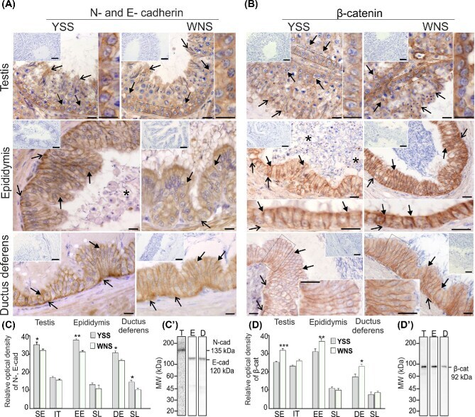 - Figure 3 Qualitative (A and B) and quantitative (C and D) analysis of immunohistochemical staining for N- and E-cadherin (A) and beta-catenin (B). Representative micrographs of yellow semen syndrome (YSS) and white normal semen (WNS) testes, epididymides, and ductuli deferentes. Counterstaining was performed with Mayer's haematoxylin. Scale bars are 10 mum. Frames indicate the location of the higher magnification view. (A and B) Similar staining pattern for N- and E-cadherin (A) and beta-catenin (B) were observed in the basal compartment at the blood-testis barrier (BTB) (arrows) and in the adluminal compartment of seminiferous epithelium (open arrows) as well as in the lateral plasma membranes of adjacent epididymal principal cells (arrows) and between principal and basal cells (open arrows), and in the lateral plasma membranes of adjacent ductal columnar cells (arrows) and between columnar and basal cells (open arrows) of YSS and WNS epididymides and ductuli deferentes. Note increased N- and E-cadherin and reduced beta-catenin staining intensity at the BTB of YSS testis (see higher magnification views in A and B) and of YSS epididymis and ductus deferens sections (see higher magnification views in B). Note weaker staining for beta-catenin between epithelial principal cells (arrows) and principal and basal cells (open arrows) along the entire YSS epididymis length (see higher magnification inserts in B). Note also sloughed germ cells admixed with mature spermatozoa in YSS ep