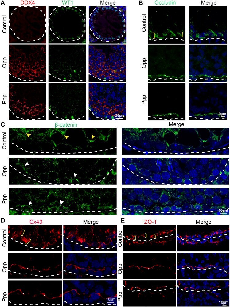 - FIGURE 6 Opp and Ppp promote BTB recovery after busulfan treatment in Sertoli cells. (A) Immunofluorescence staining of control, Opp-, and Ppp-treated testes with anti-WT1 antibody (Sertoli cell, green), anti-DDX4 antibody (germ cell, red) and DAPI (blue). White dashed line depicts the basement membrane. (B) Immunofluorescence staining of control, Opp-, and Ppp-treated testes with anti-occludin antibody (BTB, green) and DAPI (blue). Yellow scale markers signify diffusively-distributed occludin signals. White scale markers depict tightly-distributed occludin signals around Sertoli and germ cells. (C) Immunofluorescence staining of control, Opp-, and Ppp-treated testes with anti-beta-catenin antibody (BTB, green) and DAPI (blue). Yellow arrow heads signify diffusively-distributed beta-catenin signals; white arrow heads signify tightly-distributed beta-catenin signals around Sertoli and germ cells. (D) Immunofluorescence staining of control, Opp-, and Ppp-treated testes with anti-Cx43 antibody (BTB, green) and DAPI (blue). Yellow scale markers depict diffusively distributed Cx43 signals; white scale markers depict tightly-distributed Cx43 signals around Sertoli and germ cells. (E) Immunofluorescence staining of control, Opp-, and Ppp-treated testes with anti-ZO-1 antibody (BTB, red) and DAPI (blue). Yellow arrow heads label diffusively-distributed ZO-1 signals. White arrow heads label tightly-distributed ZO-1 signals.