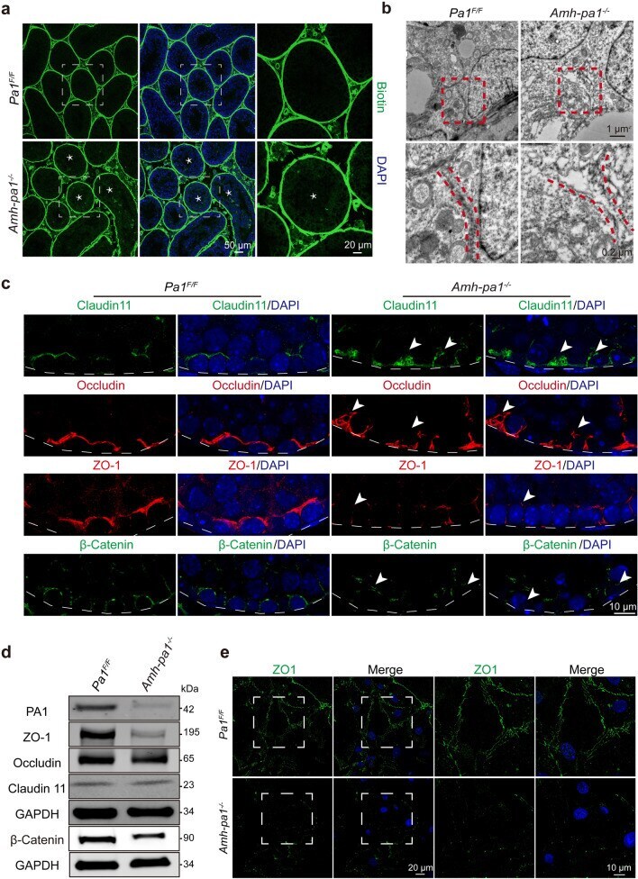 - The integrity of BTB is disrupted in Amh-pa1 -/- mice. a The integrity of the BTB was observed to be destroyed in 8-week-old Amh-pa1 -/- testes. Immunofluorescence using FITC-labeled streptavidin (green) was conducted on seminiferous tubules of Pa1 F/F (upper) and Amh-pa1 -/- testes (lower) which had been injected with biotin beneath the albuginea. Nuclei were stained with DAPI (blue). Dashed boxes showed localization of the enlarged images. Asterisks indicated biotin penetrated seminiferous tubules. b Transmission electron microscope images of adult Pa1 F/F and Amh-pa1 -/- mice testes showing the cleft junctions between Sertoli cells at the basal compartment of seminiferous tubules. Red dashed boxes showed localization of the enlarged images shown in the bottom row. Red dashed lines in the enlarged images indicate the cell-cell junctions. c BTB components are shown to be disorganized in 8-week-old Amh-pa1 -/- mice testis. Immunofluorescence analysis using anti-Claudin11, anti-Occludin, anti-ZO-1, and anti-beta-catenin was conducted in the testis of Pa1 F/F mice (left) and Amh-pa1 -/- mice (right). Nuclei were stained with DAPI (blue). Arrowheads indicate the aberrant patches or diminished signals of the BTB components. Dashed curve indicated basal membrane of seminiferous tubules. d Immunoblot analysis of BTB components, including ZO-1, Occludin, Claudin11, and beta-Catenin, in the testes of adult wild-type mice and Amh-pa1 -/- mice. e Cell junction cannot be formed between