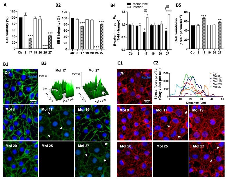 - Figure 9 HBMEC treatment with selected molecules proved lack of cytotoxicity for 3 candidates. HBMEC were exposed to each of the selected molecules (8, 17, 19, 20, 25, and 27), or no addition (control; Ctr), at a concentration of 100 uM, for 24 h, for viability assays ( A ), or at U87MG EC 50 , during 9 h, for BBB integrity ( B ) or cytoskeleton ( C ) analyses. ( A ) Cell viability was assessed by MTT assay and the values are presented as a percentage relative to control. Molecules with significant cytotoxic effects are presented as pattern-filled bars, and innocuous molecules are shown as white bars. ( B ) BBB integrity was assessed by immunostaining of beta-catenin, with nuclear counterstaining by Hoechst 33342. ( B1 ) Arrows point to gaps in the HBMEC monolayer caused by incubation with toxic molecules. ( B2 ) Semi-quantitative analysis of endothelial gaps, where values are presented as percentage of control. ( B3 ) 3D representative plots of beta-catenin expression obtained by counting the number of image pixels per area in disrupted monolayers. ( B4 ) Semi-quantitative analysis of beta-catenin internalization by fold-change of mean image pixels (Px) in the membrane and interior of treated cells vs. control. ( B5 ) Morphological analysis of HBMEC roundness by cells delineation. ( C ) Cytoskeleton analysis was performed based on F-actin labeling. ( C1 ) Arrows highlight the presence of stress fibers. ( C2 ) Cytoskeleton stress fibers profile per cell representation by semi