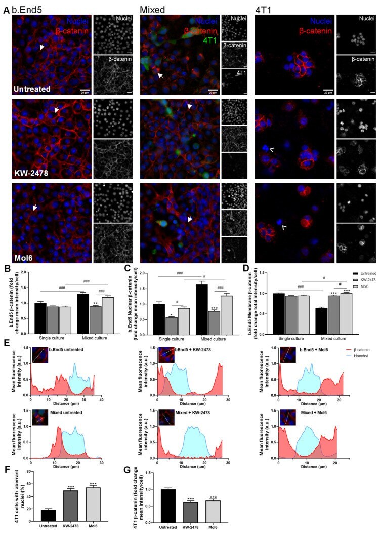 - Figure 3 KW-2478 and Mol6 enhance barrier properties through increased membrane beta-catenin expression in b.End5 cells exposed to 4T1 cells. Confluent monolayers of b.End5 cells under physiological laminar non-pulsatile shear stress were exposed to 4T1 cells (previously labelled with CellTracker(tm) CMFDA Green Dye,) and treated with KW-2478 or Mol6 (1 uM), or DMEM (untreated), for 24 h and the expression of the AJs protein beta-catenin (red), in single and mixed cultures, was evaluated by immunofluorescence analysis. Hoechst 33342 was used as counterstaining for nuclei (blue). Scale bar: 20 um. ( A ) Treatment with KW-2478 and Mol6 induced an increase in beta-catenin expression in endothelial cells exposed to 4T1 cells, particularly at cell membrane (white arrows), and an increase in 4T1 cells with aberrant nuclei (white arrow heads). Semi-quantitative analysis of endothelial beta-catenin ( B ) mean intensity per cell, ( C ) nuclear intensity, and ( D ) membrane intensity confirmed the observations. ( E )The localisation of beta-catenin was studied through plot profiles of pixel intensity throughout an endothelial cell (edge to edge). Semi-quantitative analysis of tumour cell cultures confirmed ( F ) an increase in the number of aberrant nuclei upon treatment with each drug, as well as ( G ) a decrease in beta-catenin mean intensity per cell. Data are represented as mean +- SEM of three independent experiments, where 3 cells/field, 5 fields/condition were evaluated. Statist