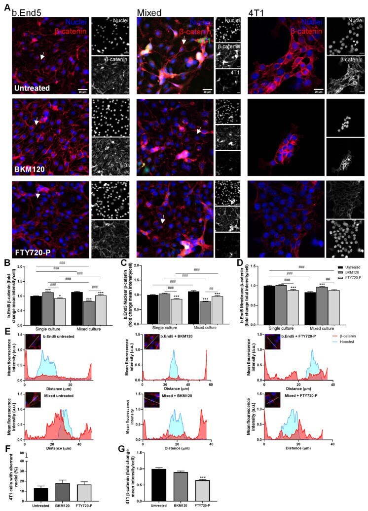 - Figure 4 BKM120 induces endothelial barrier properties through the increase in membrane beta-catenin expression. Confluent monolayers of b.End5 cells under physiological laminar non-pulsatile shear stress were exposed to 4T1 cells (previously labelled with CellTracker(tm) CMFDA Green Dye) and treated with BKM120 or FTY720-P (0.1 uM), or DMEM (untreated), for 24 h and the expression of the AJs protein, beta-catenin (red), in single and mixed cultures was evaluated by immunofluorescence analysis. Hoechst 33342 was used as counterstaining for nuclei (blue). Scale bar: 20 um. ( A ) Treatment with BKM120 or FTY720-P induced an increase in beta-catenin expression in endothelial cells exposed to 4T1 cells, particularly at cell membrane (white arrows). Semi-quantitative analysis of endothelial beta-catenin ( B ) mean intensity per cell, ( C ) nuclear intensity, and especially ( D ) membrane intensity validated these observations. ( E ) The localisation of beta-catenin was studied through plot profiles of pixel intensity throughout an endothelial cell (edge to edge). Semi-quantitative analysis of tumour cell cultures revealed ( F ) no aberrant nuclei upon treatment, but ( G ) a decrease in beta-catenin mean intensity per cell after FTY720-P treatment. Data are represented as mean +- SEM of three independent experiments, where 3 cells/field, 10 fields/condition were evaluated. Statistical significances are denoted as * p < 0.05 and *** p < 0.001 vs. untreated conditions within the same
