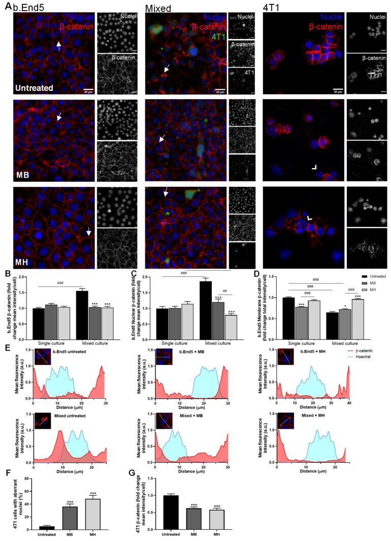 - Figure 5 MH induces endothelial barrier properties through the increase in membrane beta-catenin expression. Confluent monolayers of b.End5 cells under physiological laminar non-pulsatile shear stress were exposed to 4T1 cells (previously labelled with CellTracker(tm) CMFDA Green Dye) and treated with MB or MH (1 uM), or DMEM (untreated), for 24 h and the expression of the AJs protein beta-catenin (red) in single and mixed cultures was evaluated by immunofluorescence analysis. Hoechst 33342 was used as counterstaining for nuclei (blue). Scale bar: 20 um. ( A ) Treatment with MB and MH induced an increase in beta-catenin expression in endothelial cells exposed to 4T1 cells, particularly at cell membrane (white arrows), and an increase in 4T1 cells with aberrant nuclei (white arrow heads). Semi-quantitative analysis of endothelial beta-catenin ( B ) mean intensity per cell, ( C ) nuclear intensity, and especially ( D ) membrane intensity confirmed the observations. ( E ) The localisation of beta-catenin was studied through plot profiles of pixel intensity throughout an endothelial cell (edge to edge). Semi-quantitative analysis of tumour cell cultures revealed ( F ) an increase in aberrant nuclei upon treatment with each drug, as well as ( G ) a decrease in beta-catenin intensity per cell. Data are represented as mean +- SEM of three independent experiments, where 3 cells/field, 10 fields/condition were evaluated. Statistical significances are denoted as * p < 0.05 and *** p