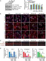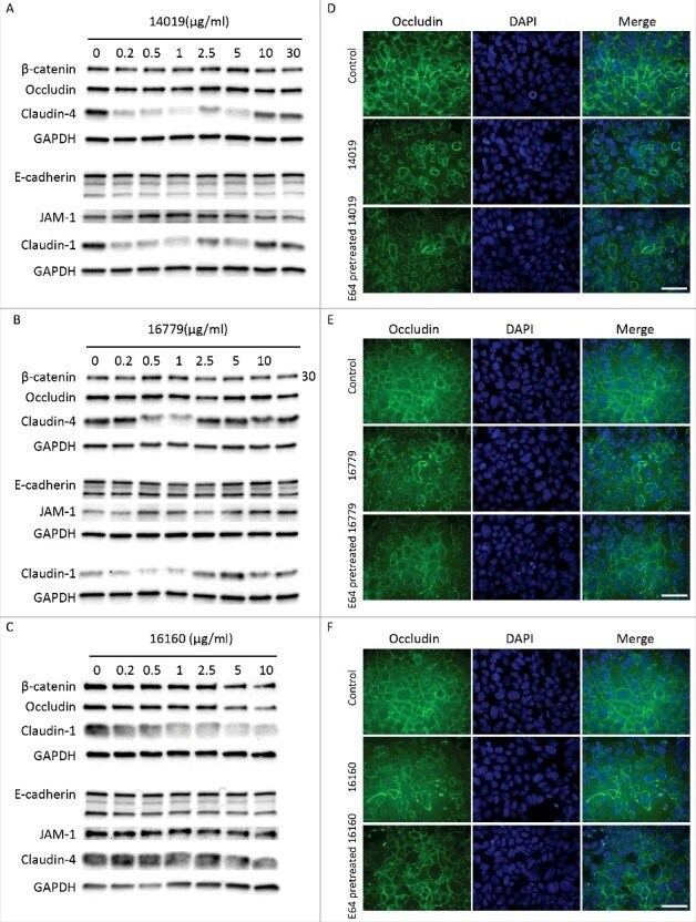 - Figure 5. G. intestinalis secreted cysteine proteases have effects on epithelial barrier proteins. A, B, C. Levels of tight junction and adherence junction proteins in Caco-2 whole cell extracts were examined after 24 h of recombinant cysteine proteases treatment (A, 14019; B, 16779; C, 16160), respectively, by Western blot analysis, with GAPDH used as a loading control. Barrier proteins were detected with a mouse or rabbit anti-barrier protein antibody and then incubated with a HR- conjugated mouse or rabbit antibody. D E, F. The localization of occludin in Caco-2 cells visualized by immunofluorescence microscopy. Caco-2 monolayers were incubated with 2.5 ug/ml of 14019 (D), 16779 (E), 16160 (F) in the absence or presence of E64 (10 uM) for 24 h, followed by fixation of PFA. Occludin was detected with a mouse anti-occludin antibody and then incubated with an Alexa Fluor 488-conjugated mouse antibody. Images were taken by a Zeiss Axioplan II Imaging fluorescence microscope and analyzed by ZEN 2.1 software. Bar = 50 um.