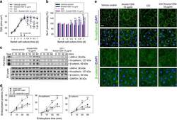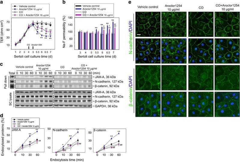 - Figure 5 The effects of Aroclor1254 on the barrier function of SC epithelium after inhibiting the caveolin-dependent endocytosis. The SCs were treated with or without Aroclor1254 in the presence or absence of CO as the regimen depicted in Supplementary Figure S2a . ( a and b ) The barrier function of SC epithelium measured by recording TER ( a ) or calculating the permeability of Na-F ( b ) across the cell monolayer. The Na-F permeability in the vehicle control on day 3 was arbitrarily set at 100%. CO treatment was found to partially resist the disruption of BTB by Aroclor1254. Each bar refers to mean+-S.D. of n =3 experiments using different batches of SCs. ** P