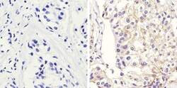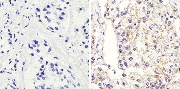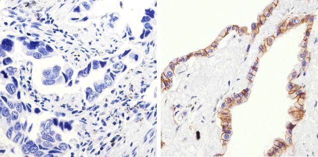 - Immunohistochemistry analysis of Beta-Catenin showing staining in the membrane and cytoplasm of paraffin-embedded human lung adenocarcinoma (right) compared to a negative control without primary antibody (left). To expose target proteins, antigen retrieval was performed using 10mM sodium citrate (pH 6.0), microwaved for 8-15 min. Following antigen retrieval, tissues were blocked in 3% H2O2-methanol for 15 min at room temperature, washed with ddH2O and PBS, and then probed with a Beta-Catenin Rabbit Polyclonal Antibody (Product # 71-2700) diluted in 3% BSA-PBS at a dilution of 1:100 overnight at 4°C in a humidified chamber. Tissues were washed extensively in PBST and detection was performed using an HRP-conjugated secondary antibody followed by colorimetric detection using a DAB kit. Tissues were counterstained with hematoxylin and dehydrated with ethanol and xylene to prep for mounting.
