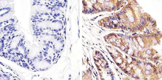- Immunohistochemistry analysis of Beta-Catenin showing membrane and weak cytoplasm staining of paraffin-embedded mouse colon tissue (right) compared to a negative control without primary antibody (left). To expose target proteins, antigen retrieval was performed using 10mM sodium citrate (pH 6.0), microwaved for 8-15 min. Following antigen retrieval, tissues were blocked in 3% H2O2-methanol for 15 min at room temperature, washed with ddH2O and PBS, and then probed with a Beta-Catenin Rabbit Polyclonal Antibody (Product # 71-2700) diluted in 3% BSA-PBS at a dilution of 1:20 overnight at 4°C in a humidified chamber. Tissues were washed extensively in PBST and detection was performed using an HRP-conjugated secondary antibody followed by colorimetric detection using a DAB kit. Tissues were counterstained with hematoxylin and dehydrated with ethanol and xylene to prep for mounting.