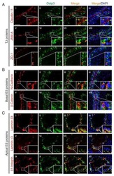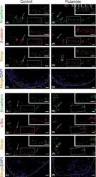 - Immunofluorescent localization of N-cadherin and beta-catenin (A-H), and N-cadherin and c-Src (I-P) in testes of control (A-D and I-L) and flutamide-exposed (E-H and M-P) rats. Corresponding images were merged to show areas of colocalization of N-cadherin and beta-catenin (C, G), and N-cadherin and c-Src (K, O). Scale bars represent 15 mum. Rectangles indicate the location of the higher magnification view. In tubules of control rats, typical localizations of N-cadherin (arrows in A and I), beta-catenin (arrow in B) and c-Src (arrow in J) are visible at the BTB . Note also the colocalization of N-cadherin with beta-catenin (arrow in C) and N-cadherin with c-Src (arrow in K) at the BTB . In tubules of flutamide-treated rats, increased N-cadherin signal is observed (arrows in E and M) as well as diffusion of N-cadherin and beta-catenin signals from the BTB site (arrows and brackets in E, M, and F, respectively). Note altered distribution of c-Src (arrow in N). The colocalization of N-cadherin with beta-catenin and N-cadherin with c-Src is absent, see green and red staining (double arrows in G and O, respectively). Cell nuclei were stained with DAPI (blue; D, H, L and P). Dotted-line circles (D, H, L and P) outline the periphery of seminiferous tubules.