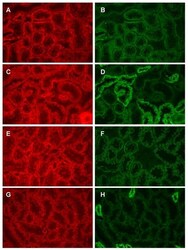 - Figure 7 beta-catenin is colocalized with both N-cadherin and E-cadherin. Samples were processed for the dual labeling of beta-catenin and either N- or E-cadherin as described in the methods and viewed using a 40x objective. Panels A and B show the dual labeling of beta-catenin (A) and N-cadherin (B) in a field from the outer cortex whereas panels C and D show the dual labeling of beta-catenin (C) and E-cadherin (D) in a similar field. Panels E-F show the same molecules in fields from the inner cortex. E and F: dual labeling of beta-catenin (E) and N-cadherin (F); G and H dual labeling of beta-catenin (G) and E-cadherin (H). Original magnification = 174x.