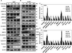 - Figure 4 CuB inhibits the Wnt/beta-catenin signaling in the NSCLC cells. A549 (Panel A ) and H1299 cells (Panel B ) were treated with 0-100 nM of CuB for 24 h and whole cell lysates were prepared. Western blot analysis was performed to analyze the expression of Wnt/beta-catenin pathway proteins. Blots are representative of three independent experiments. Graphs in (Panel C , D ) represent relative band intensities of proteins in A549 and H1299 cells normalized to beta-actin. The results were obtained from three independent experiments, mean +- SEM. *p < 0.05 versus Control.