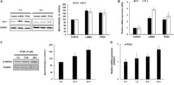 - Figure 3. Effects of TNFalpha on the steady-state levels of integral membrane, scaffolding and regulatory proteins in Sertoli cells in vitro. Sertoli cells were cultured at high density on Matrigel(tm)-coated 12-well dishes as described in Materials and Methods. On day 4 (designated as 0 h in this figure), TNFalpha (25 ng/ml) was added into Sertoli cell cultures, and cells were terminated at specific time points thereafter for lysate preparation. TNFalpha was dissolved in 10 mM NaH 2 PO 4 pH 7.4 at 22degC containing 0.15 M NaCl and 0.1% BSA (wt/vol). The control consisted of culturing Sertoli cells in media containing an equivalent amount of BSA. ( A ) Immunoblots of selected proteins involved in the regulation and in the maintenance of Sertoli cell barrier function. Actin served as an indicator of equal protein loading. ( B ) Histograms summarizing results shown in ( A ) from at least three independent experiments. Histograms are not shown for proteins whose levels did not change significantly. Each data point was normalized against its corresponding actin data point and then against the protein level at 0 h, which was arbitrarily set as 1. Each bar represents the mean +- SD of n = 3-4 experiments. **p < 0.01 (ANOVA followed by Dunnett's post-hoc test). n.d., not determined.