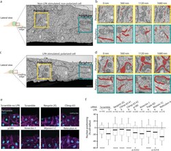 - Nuclear positioning is associated with ER morphology remodeling and requires Climp-63. a FIB-SEM representative image of non-LPA stimulated, non-polarized wound-edge U2OS cell. One stack of 998 SEM images from one leading edge cell. b Representative images of perinuclear (yellow insets) and peripheral (green insets) regions. The ER is highlighted in red, light red represents tubules (1 um). Measurements represent the depth of the section. c as in a , but an LPA stimulated and polarized cell. One stack of 1798 SEM images from one leading edge cell. d as in b , but an LPA stimulated and polarized cell. e Representative widefield epifluorescence images of wound-edge NIH3T3 fibroblasts. Cells were immunostained for cell-cell contacts (purple; beta-catenin), centrosome (white; pericentrin) and DNA (DAPI, blue). f Nuclear positions relative to the cell centroid of cells represented in e . Significance (Two-tailed unpaired t-test) was calculated between experimental condition and the scramble siRNA with LPA. **** p < 0.0001 (Scramble no LPA, Nesprin-2G, Climp-63 #1, Climp-63 #2, Triple KD); * p < 0.05. Box shows first quartile, median and third quartile, and whiskers show 10-90% percentile. Experiments were repeated >=3, except ( a - d ). Scale bars: a , b , c , d 1 um; e 40 um.