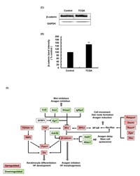 - Figure 3C-E TCQA enhanced beta-catenin expression in the hair follicle. ( C ) beta-catenin protein expression was determined at the end of the treatment period. The protein was extracted from the treated area from the mice dorsal part, and western blot was carried away. ( D ) Band intensities was done assessed using LI-COR system. Results represent the mean +- SD of three independent experiments. *Statistically significant ( P