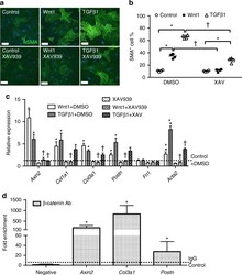 - Fig. 7 Wnt/beta-catenin signaling induces cultured CF activation and ECM gene expression downstream of Tgfbeta signaling in vitro. a Representative images of alphaSMA ( green ) staining in cultured P60 CFs under indicated conditions are shown. Scale bar = 100 mum. b Wnt1 (100 ng/mL) and TGFbeta1 (10 ng/mL) induces significantly more alphaSMA + CFs relative to DMSO controls in cultured P60 CFs. Inhibition of Wnt/beta-catenin signaling by XAV939 (5 muM) abrogated Wnt1-induced alphaSMA expression in CF and also partially suppressed TGFbeta1-induced alphaSMA expression. * P < 0.05 vs. DMSO groups, + P < 0.05 vs. Control. c mRNA expression of the Wnt target gene Axin2 , and ECM genes Col1a1 , Col3a1 , Postn , and Acta2 in P60 CFs with indicated treatments was measured by quantitative PCR. * P < 0.05 vs. control, + P < 0.05 vs. DMSO. N = 4 independent cultures per group. Statistical significance was determined by Kruskal-Wallis tests followed by Mann-Whitney U tests for pairwise comparisons using Bonferonni adjustments to control for multiple testing. d ChIP assays were performed using P0 cultured CFs treated with BIO (2 muM) to determine the binding of beta-catenin in protein complexes with TCF/LEF consensus containing proximal sequences of Axin2 , Col3a1 , and Postn genes. Compared to IgG negative control, binding of beta-catenin to Col3a1 and Postn was significantly enriched. Axin2 was used as positive control. N = 4 independent cultures per group. Fold enrichment of DNA binding