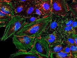 - HeLa cells were plated on coverslips overnight. The next day the cells were fixed and permeabilized using the Image-iT® Fixation/Permeabilization Kit (Product # R37602) according to protocol. Cells were then incubated with 3 µg/mL anti-B-catenin (Product # 71-2700) for 60 mins at RT followed by 3 wash steps in dPBS. Cells were then incubated with a 1:1000 dilution of goat anti-rabbit Qdot® 655 (Product # Q11422MP) secondary antibody for 60 mins followed by 3 wash steps in dPBS. Cells were labeled with ReadyProbes® reagents NucBlue® Live (Product # R37605) and ActinRed 555 (Product # R37112) according to protocol. Coverslips were then mounted using ProLong® Gold Antifade Reagent (Product # P36930). Images were taken using the EVOS® FL Auto Imaging System and a 40X coverslip-corrected objective (Product # AMEP4699).