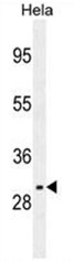 - C1orf110 Antibody (C-term) (Cat. #AP50527PU-N) western blot analysis in Hela cell line lysates (35µg/lane).This demonstrates the C1orf110 antibody detected the C1orf110 protein (arrow).
